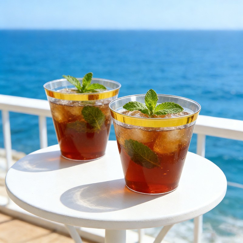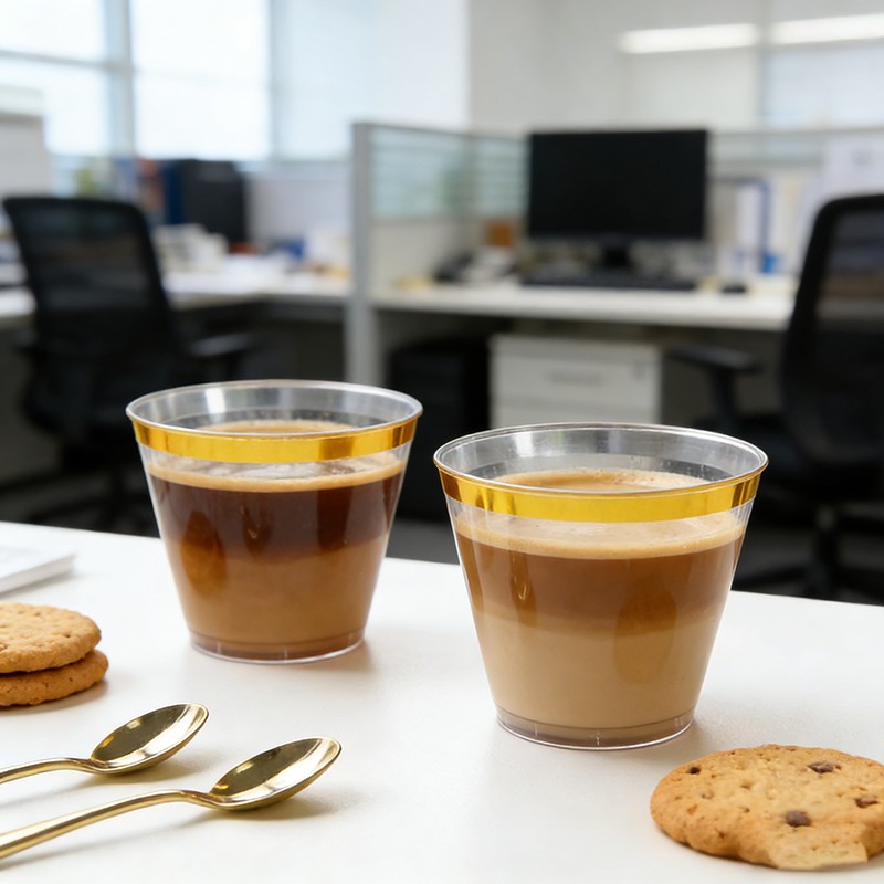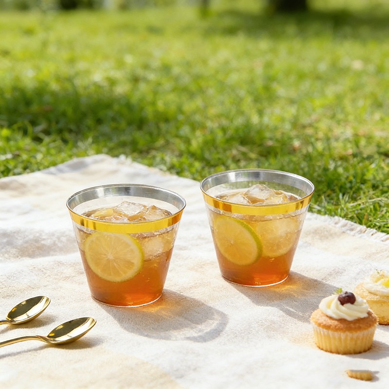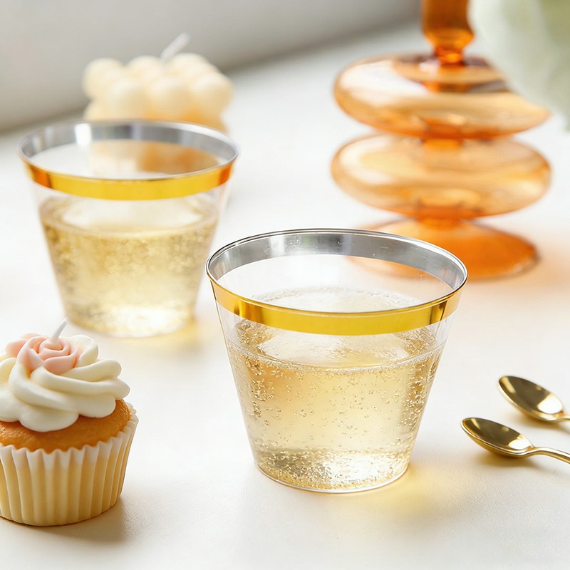 clear cup + gold rimMatériau robuste de qualité supérieureFabriqué en plastique transparent de qualité alimentaire, sans BPA ; robuste, résistant aux fissures et étanche, idéal pour les boissons froides, les cocktails, le vin, les sodas et autres boissons.