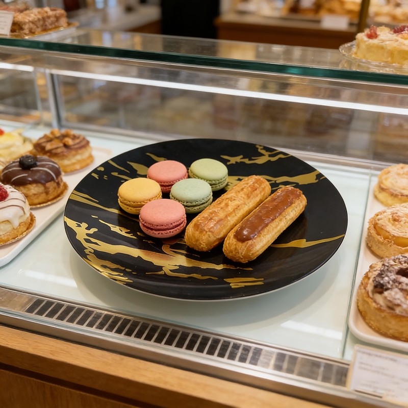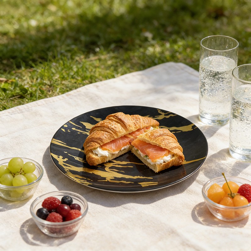 Le veinage doré, fluide et audacieux, du marbre sur un fond noir brillant crée une allure luxueuse et contemporaine, évoquant la vaisselle en pierre de qualité supérieure. Idéales pour les mariages prestigieux, les banquets d'entreprise et les fêtes de fin d'année, ces assiettes rehaussent instantanément toute table et s'accordent à merveille avec des couverts métalliques et des serviettes en lin.