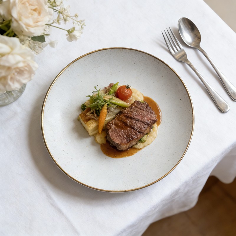 Design classique élégantAssiette ronde blanche à bordure dorée délicate, simple mais luxueuse, s'harmonisant facilement avec tous les thèmes de fête, les styles de table et de traiteur.