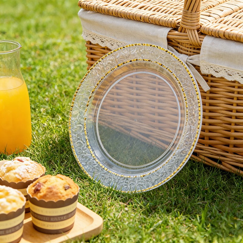 clear plate + gold rimMatériaux de qualité alimentaire supérieureFabriqué en plastique de haute qualité sans BPA, robuste, rigide, résistant aux fissures et sans danger pour tous types d'aliments.