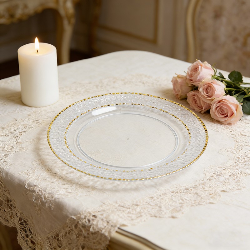 Design raffiné et élégantAssiette transparente avec un délicat liseré doré brillant, élégante et haut de gamme, qui sublimera n'importe quelle table.