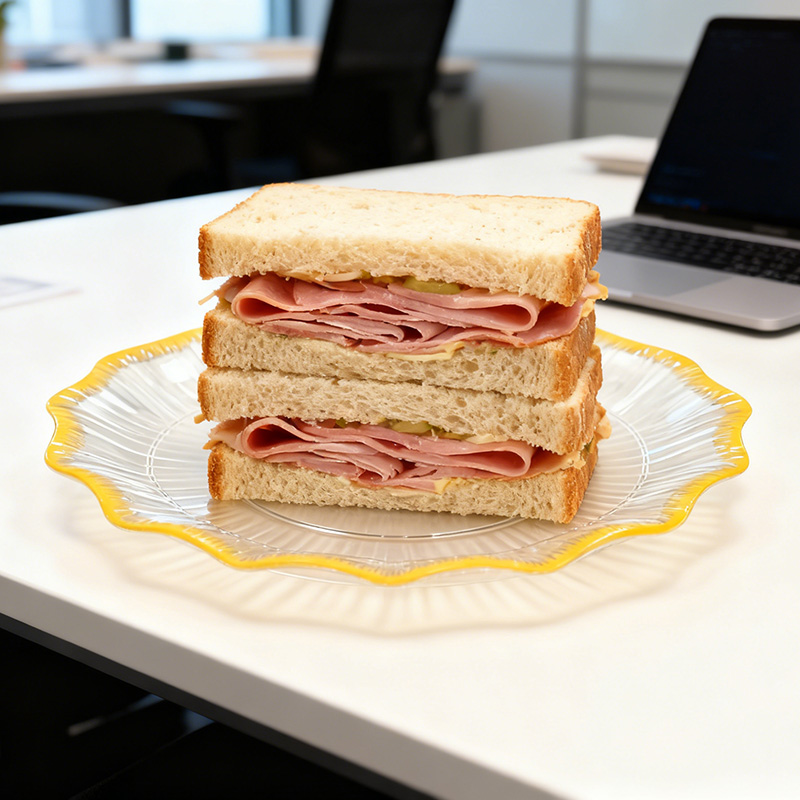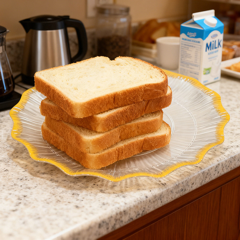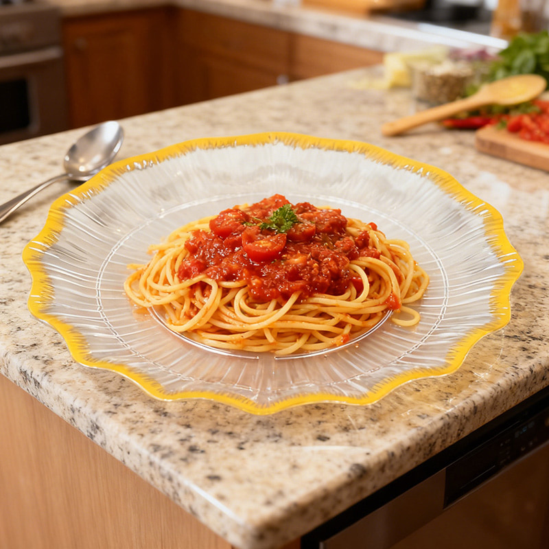 Design élégant et fonctionnel: Se distingue par sa texture étoilée attrayante (qui offre une prise en main antidérapante et des réfractions de lumière pour une meilleure présentation des aliments), son corps transparent qui met en valeur les couleurs éclatantes des aliments et son délicat bord doré qui apporte une touche de luxe et de sophistication.