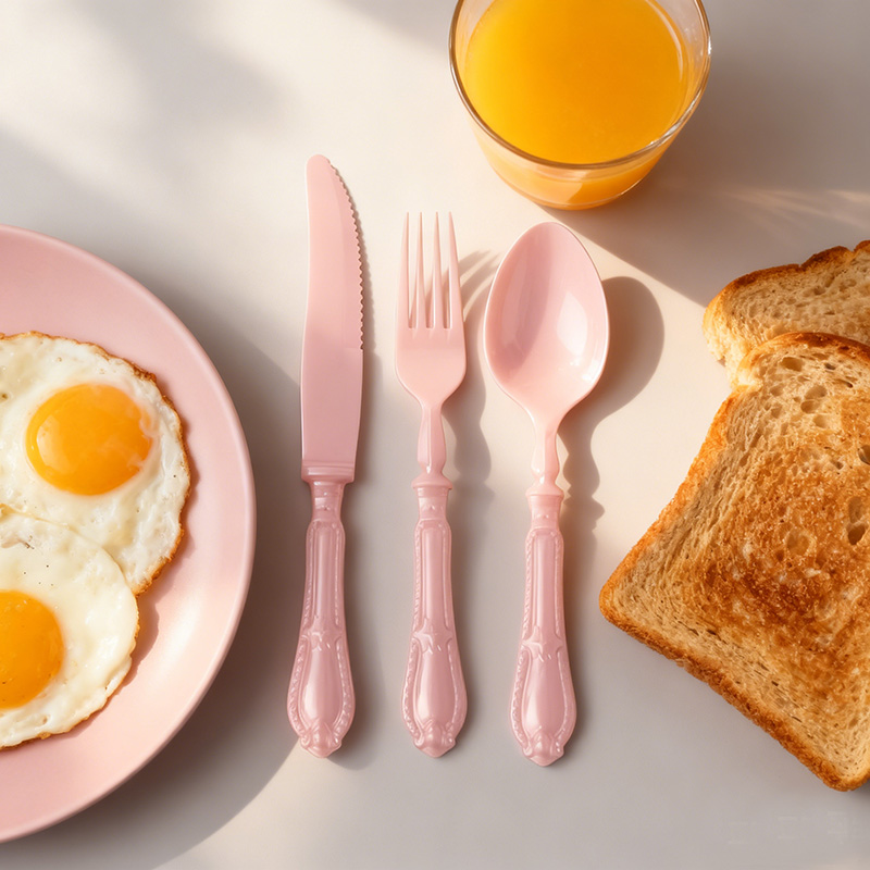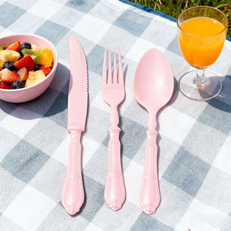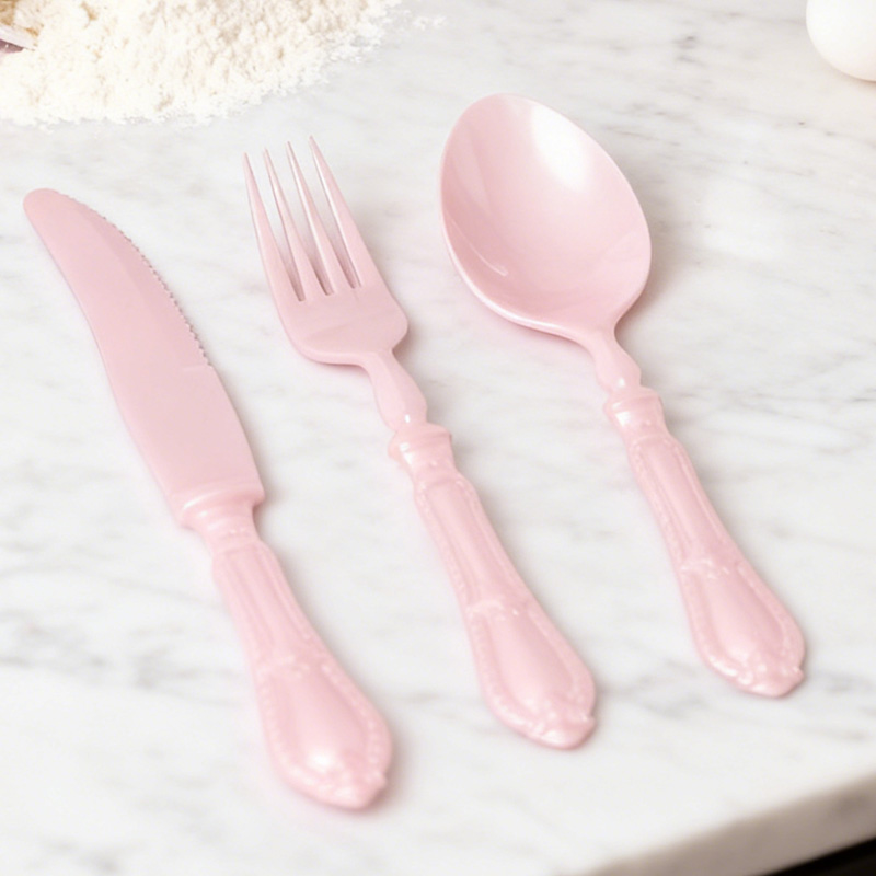 PinkMatériau sûr de qualité supérieure : Ensemble de couverts jetables 3 pièces (couteau, fourchette, cuillère) en plastique de qualité alimentaire sans BPA ; robuste et résistant à la flexion, avec un tranchant de couteau aiguisé, des dents de fourchette durables et une forme de cuillère fonctionnelle pour divers aliments de fête.