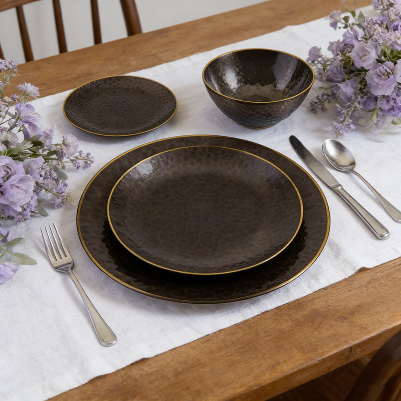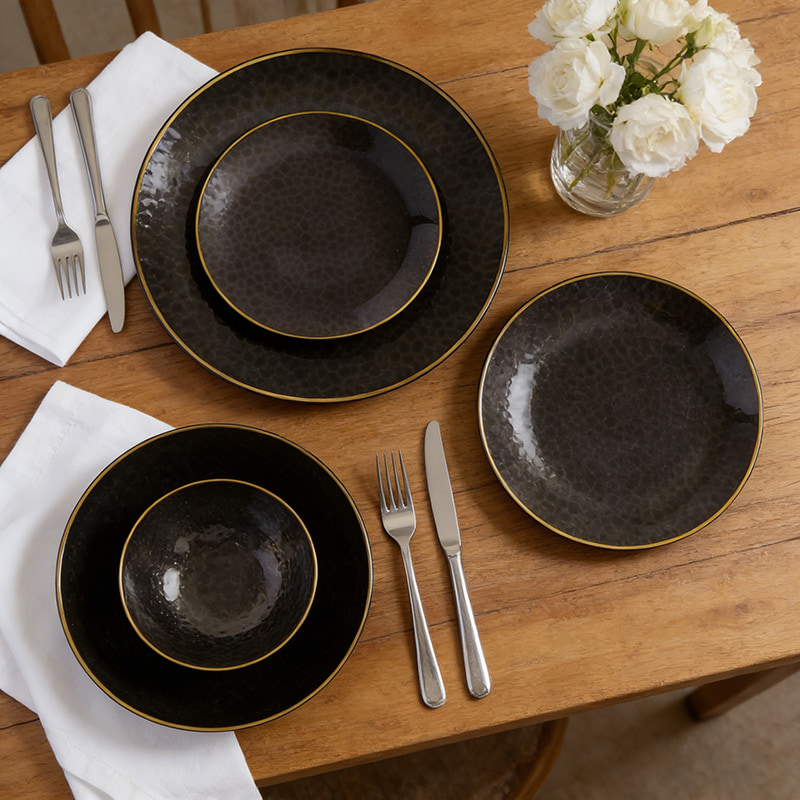 clear black plate with gold rimEsthétique haut de gammeLa texture martelée et le liseré doré imitent la vaisselle de luxe, idéale pour les événements haut de gamme.