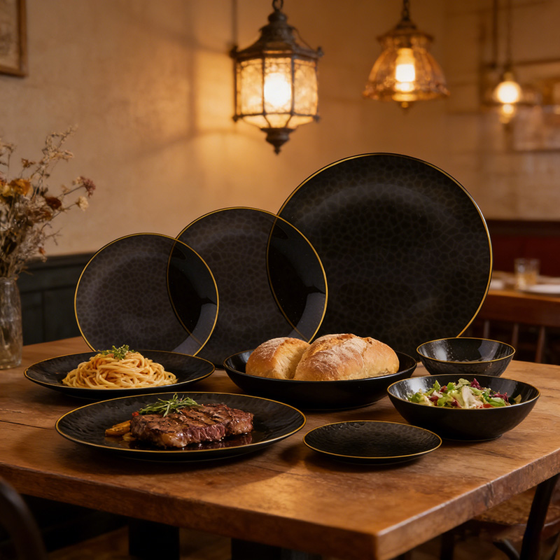 | Couleur | Assiette noire transparente à bordure dorée | ||||