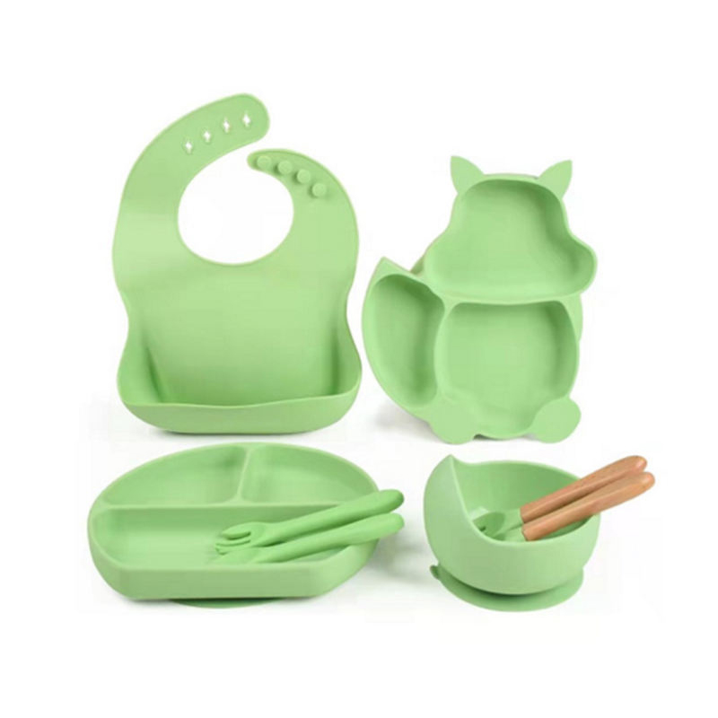 CustomizedEnsemble complet FoxComprend une plaque à ventouse, un bol à ventouse, un bavoir en silicone, une cuillère en bois naturel, ainsi qu'une cuillère et une fourchette supplémentaires.
