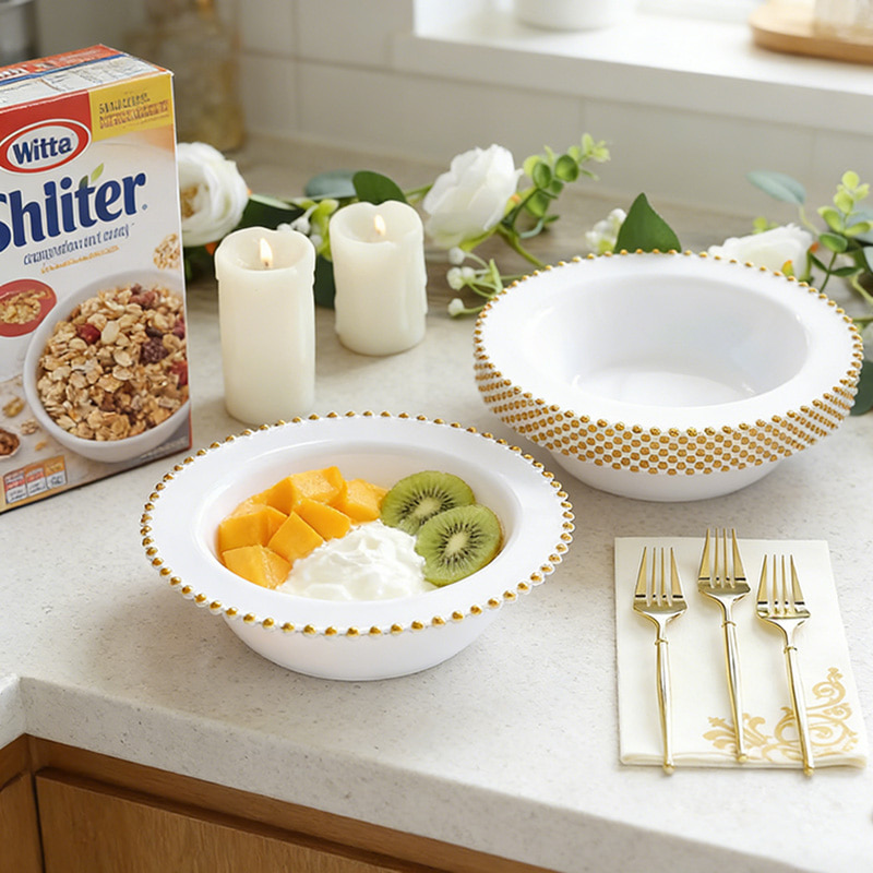 The handcrafted gold pearl beaded edge elevates the classic white bowl, turning casual picnics and formal weddings into elegant affairs.