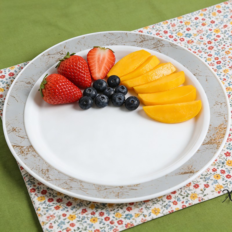 white plate + marble rimDesign élégant à bordure en marbre doréSocle blanc et bordure en marbre doré : sublime l'esthétique des repas et du service.