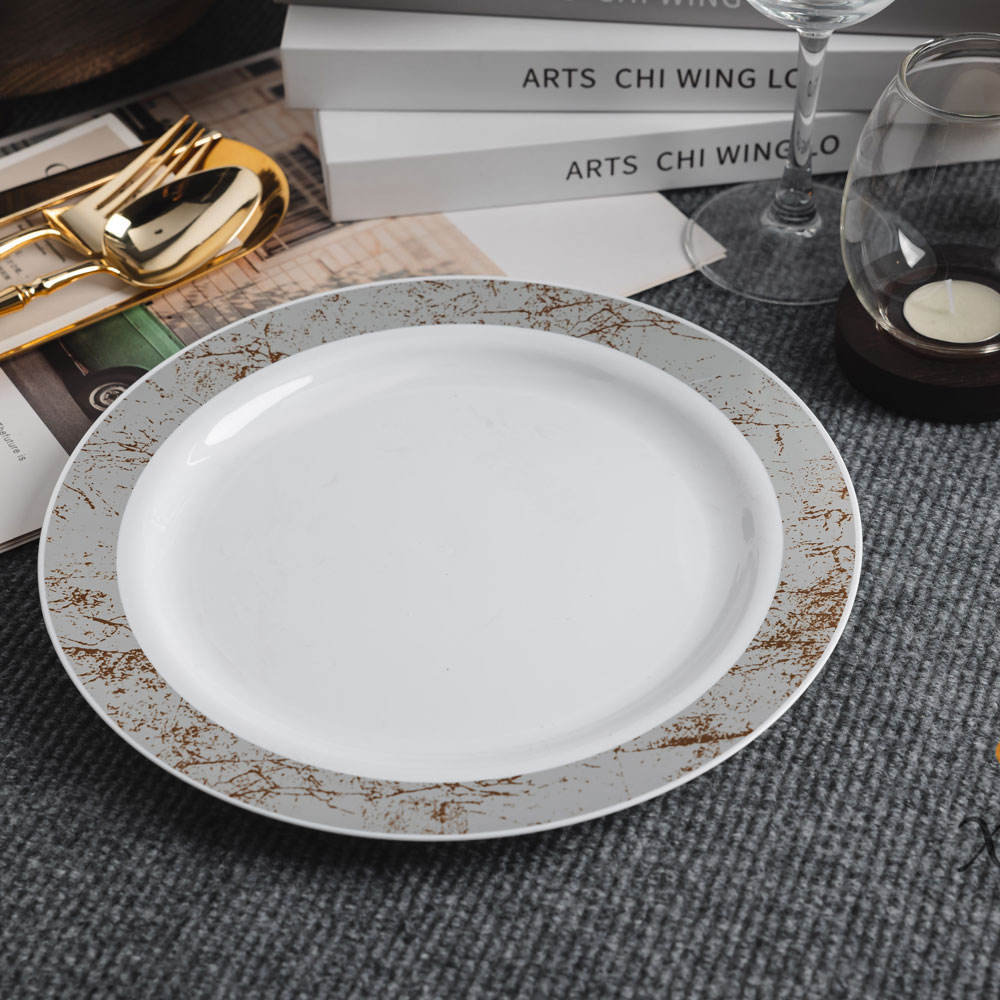 ✨Assiette plate en plastique blanc avec bord en marbre doréVaisselle élégante et raffinée avec une finition haut de gamme